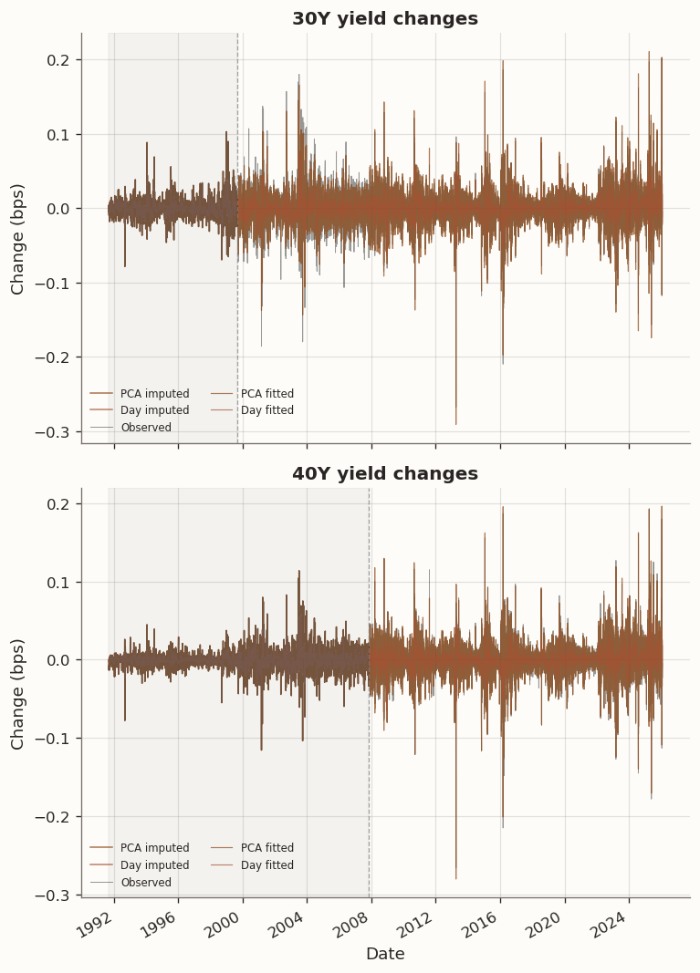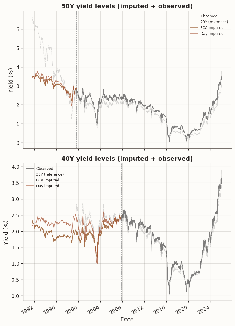 The reconstructed levels are most useful as inputs for downstream applications that require a complete panel (e.g., covariance estimation across the full yield curve history), but we should be aware that the imputed 40Y levels in the pre-2007 period reflect post-2007 loading geometry and may understate the true 30Y–40Y spread in the earlier regime.