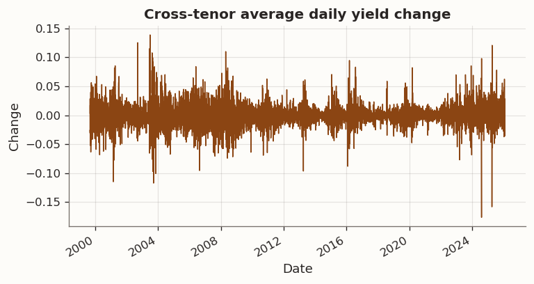 The data are Japanese Ministry of Finance constant-maturity JGB yields. We work with a stable subset of tenors (in years) and compute daily yield changes. We standardize each rolling window using train-window statistics only; the train mean and standard deviation are applied to the test window with no leakage.