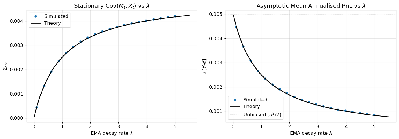 Figure 2: Stationary covariance \Sigma_{XM} (left) and mean annualised PnL (right) vs EMA decay rate \lambda. Faster EMA tracking increases correlation and reduces expected PnL.