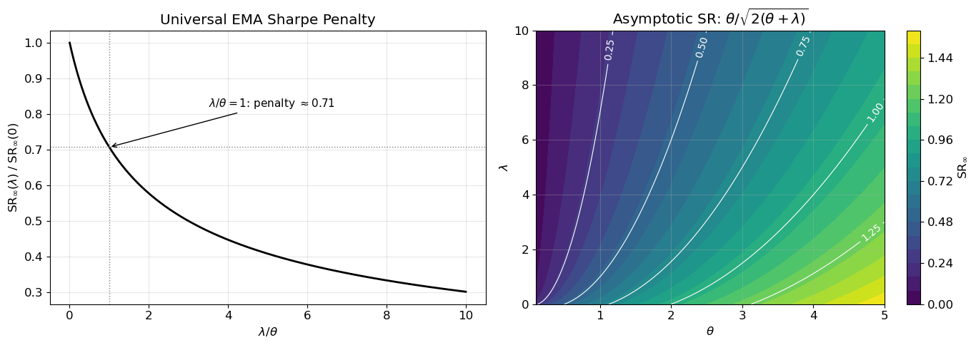 The penalty factor \sqrt{\theta/(\theta+\lambda)} depends only on the ratio \lambda/\theta. At \lambda = 0 (no estimation) we recover the Part 1 result; at \lambda = \theta the penalty is 1/\sqrt{2} \approx 0.71; and as \lambda \to \infty the EMA tracks the price too closely and the Sharpe ratio vanishes. Figure 3 and Figure 4 confirm these predictions via Monte Carlo and display the universal penalty curve.