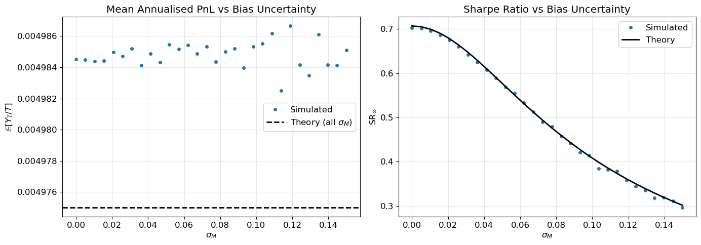 Left: expected PnL is invariant to bias uncertainty. Right: SR degrades with sigma_M.