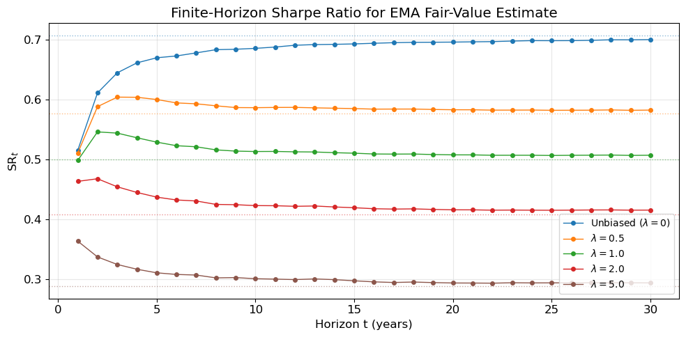 The EMA corresponds to exponential weights w(u) = \lambda e^{-\lambda u}; a simple moving average over a window \tau uses rectangular weights w(u) = 1/\tau for u \in [0,\tau]. In every case, the trailing estimate injects positive correlation, and the expected PnL falls below the perfect-information benchmark \sigma^2/2. The positive-correlation penalty is therefore not a modelling artefact of the EMA but an unavoidable cost of inferring fair value from price history under mean reversion. Figure 5 illustrates the finite-horizon convergence of the Sharpe ratio for several EMA decay rates.