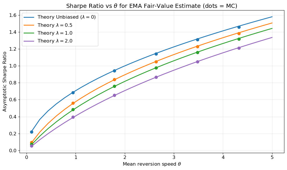 Figure 3: Sharpe ratio vs \theta for different EMA decay rates. Lines are the closed-form \theta/\sqrt{2(\theta+\lambda)}; dots are Monte Carlo estimates.