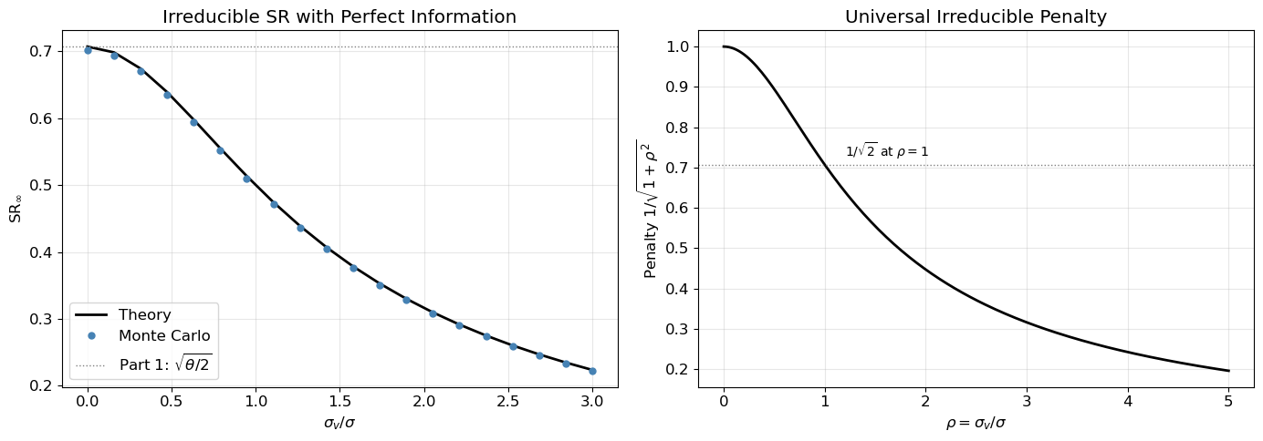 Figure 1: Irreducible penalty from fair-value noise. Left: SR vs \sigma_v/\sigma with perfect information (M=0), comparing theory to Monte Carlo. Right: the penalty factor 1/\sqrt{1+\rho^2} as a universal curve.