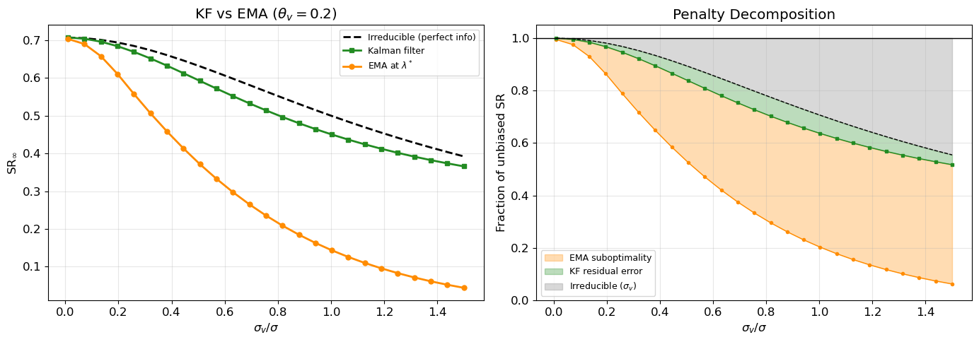 Figure 4: Kalman filter vs EMA comparison. Left: SR of KF (via Riccati solution) and EMA (at optimal \lambda^*) vs \sigma_v/\sigma. The gap grows with fair-value noise. Right: penalty decomposition into three layers: irreducible, KF-residual, and EMA-suboptimality.
