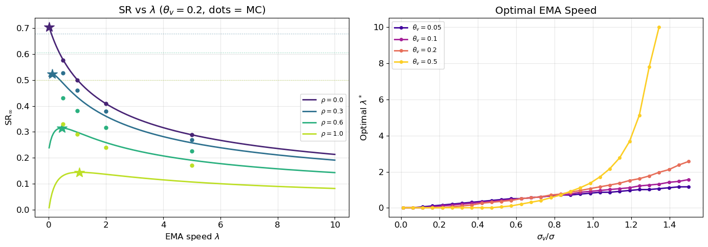 Figure 3: Sharpe ratio vs EMA speed under two-scale OU model. Left: SR(\lambda) for several \sigma_v values with \theta_v = 0.2. Stars mark optimal \lambda^*. Dashed lines show irreducible SR. Right: optimal \lambda^* vs \sigma_v/\sigma for several \theta_v values.