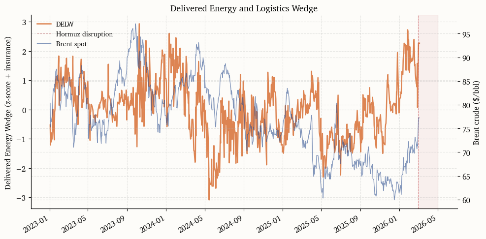 The Delivered Energy and Logistics Wedge (DELW) captures the marginal cost of transporting crude oil beyond the benchmark price. When a chokepoint closes, the wedge between the landed cost of a barrel and its exchange-traded benchmark widens through two channels: freight rates jump as vessels reroute, and war-risk insurance either becomes prohibitively expensive or unavailable entirely.