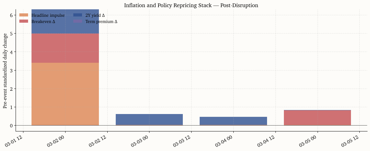 The purpose of this consolidated view is to answer the central question posed in the introduction: does the rate market treat the shock as transitory (stable front end, term-premium-driven long end) or does it price second-round inflation risk (breakeven widening, policy-path repricing)?