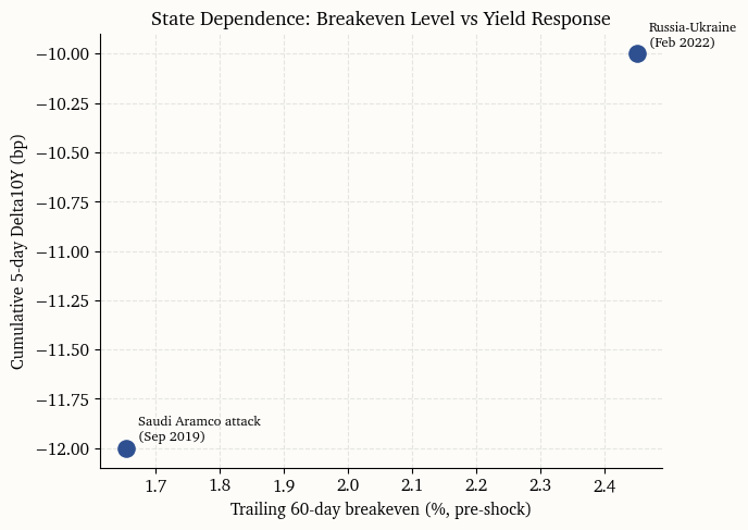 To evaluate this state dependence, the trailing 60-day average of the 10-year breakeven rate serves as a conditioning variable. The idea is that a high baseline breakeven signals fragile credibility, making the rate market more sensitive to energy-driven inflation impulses. The chart below shows the relationship between the pre-shock breakeven level and the cumulative yield response in the first five trading days after the event.