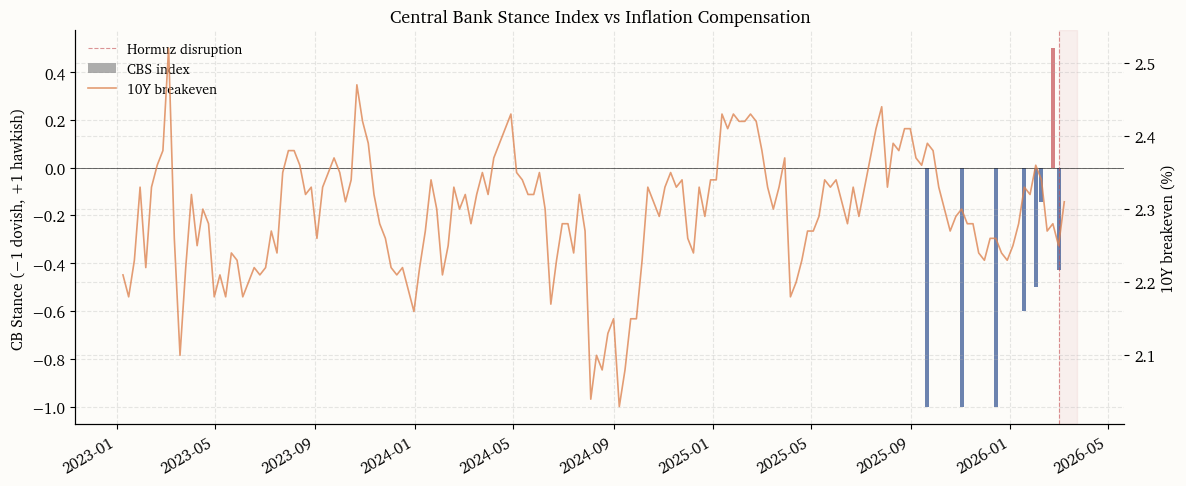 # ---------------------------------------------------------------------------# Aggregate to weekly Central Bank Stance (CBS) index# ---------------------------------------------------------------------------stance_df = pd.DataFrame([ {"date": pd.Timestamp(r["date"]), "stance": r["doc_stance"], "n_relevant": r["n_relevant"]}for r in stance_results])stance_df = stance_df.set_index("date").sort_index()# Weekly aggregation (mean stance, weighted by document relevance)weekly_stance = ( stance_df .resample("W") .apply(lambda g: np.average(g["stance"], weights=np.maximum(g["n_relevant"], 1)) iflen(g) >0else np.nan))weekly_stance = weekly_stance.dropna()weekly_stance.name ="CBS"# Plot: CBS index overlaid with breakeven and policy-path changesfig, ax1 = plt.subplots(figsize=(12, 5))# CBS index (bar chart)colors_bar = [PALETTE["red"] if v >0else PALETTE["blue"] if v <0else PALETTE["grey"]for v in weekly_stance.values]ax1.bar(weekly_stance.index, weekly_stance.values, width=5, color=colors_bar, alpha=0.7, label="CBS index")ax1.set_ylabel("CB Stance (−1 dovish, +1 hawkish)")ax1.axhline(0, color="black", lw=0.4)_event_shade(ax1)# Overlay: breakeven (right axis)ax2 = ax1.twinx()be_weekly = fred_df["T10YIE"].resample("W").last().dropna()ax2.plot(be_weekly.index, be_weekly.values, color=PALETTE["orange"], lw=1.2, alpha=0.8, label="10Y breakeven")ax2.set_ylabel("10Y breakeven (%)")ax1.set_title("Central Bank Stance Index vs Inflation Compensation")lines1, labels1 = ax1.get_legend_handles_labels()lines2, labels2 = ax2.get_legend_handles_labels()ax1.legend(lines1 + lines2, labels1 + labels2, loc="upper left")fig.autofmt_xdate()plt.tight_layout()plt.show()