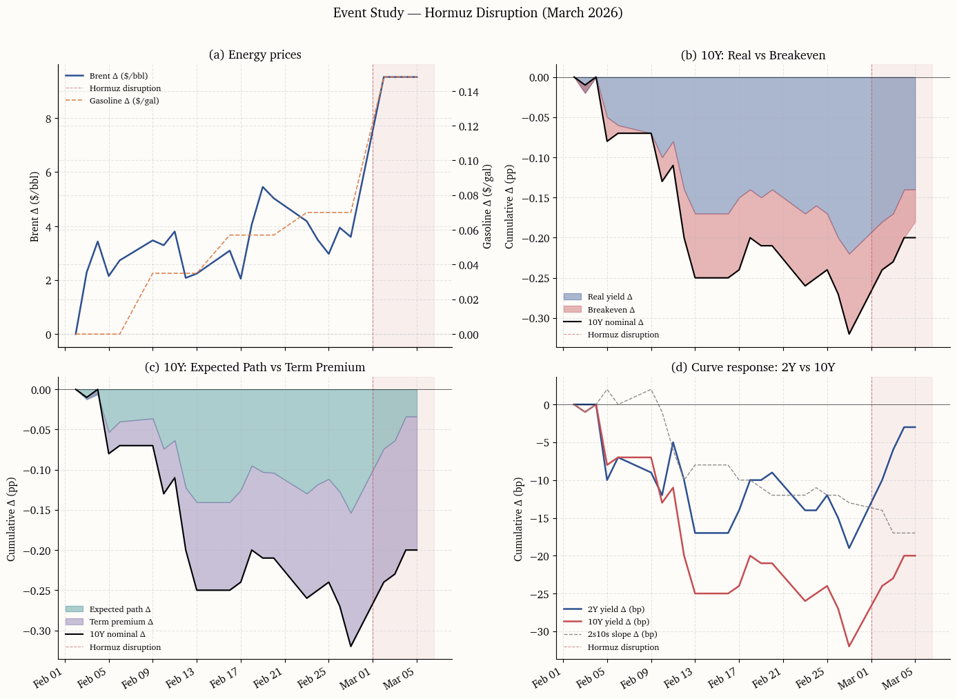 This section brings together the three indices and the yield decomposition in a single event-study window centered on the onset of the Hormuz disruption. The window spans 20 business days before the event through 40 business days after, capturing both the pre-shock baseline and the full initial market response.
