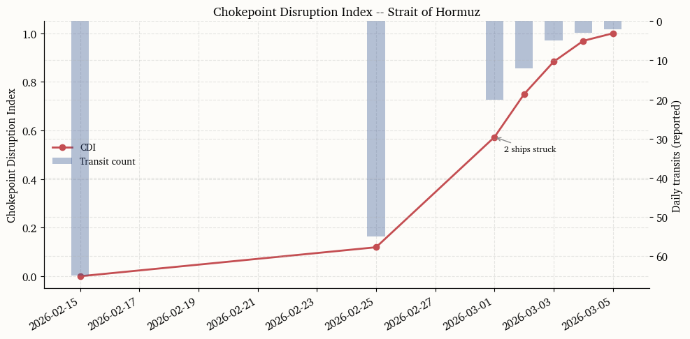 The Chokepoint Disruption Index (CDI) converts the qualitative facts table into a single daily scalar that measures the intensity of physical route impairment. The index combines two standardized components. The first is the transit-count collapse, measured as the z-score of the logarithm of daily transits relative to a trailing baseline. The second is the anchored-vessel spike, standardized in the same way. Formally,