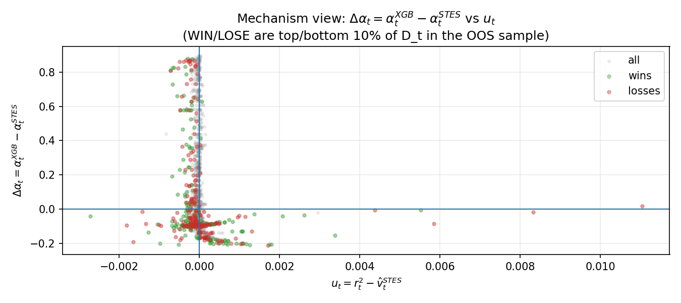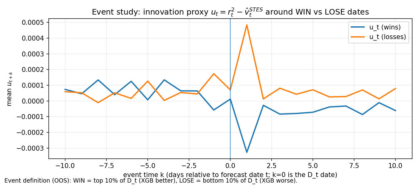 The innovation event study shows that LOSE dates coincide with large positive u (realized variance exceeding the STES-based state estimate), while WIN dates coincide with large negative u (variance lower than the STES estimate). This suggests a strong asymmetry: XGB tends to win when STES is too high, and tends to lose when variance surges.