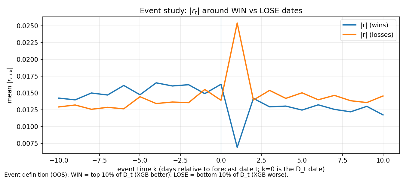 The return-magnitude event study shows that LOSE dates are associated with a large spike in \lvert r \rvert at k=1, whereas WIN dates show a dip at k=1. This is consistent with the interpretation that LOSE episodes coincide with large shocks arriving immediately after the forecast date.