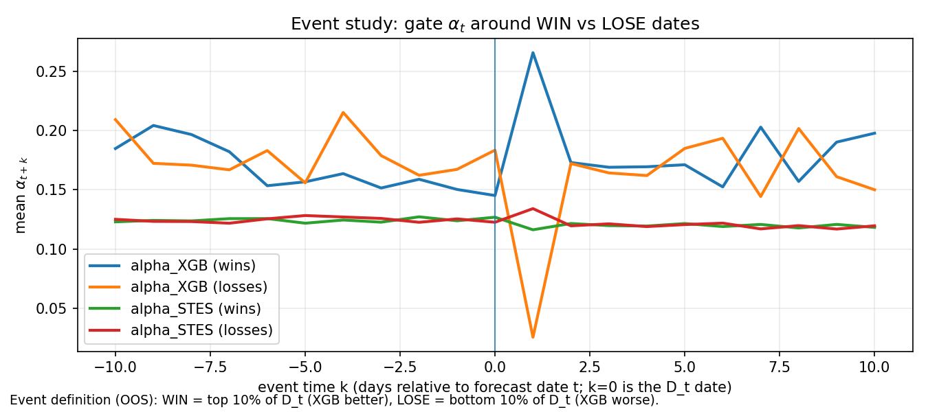 XGB win vs lose datesThe gate event chart indicate that STES \alpha remains relatively stable and similar across WIN/LOSE events. However, XGB \alpha diverges strongly: it spikes around WIN events and collapses around LOSE events near the shock timing.