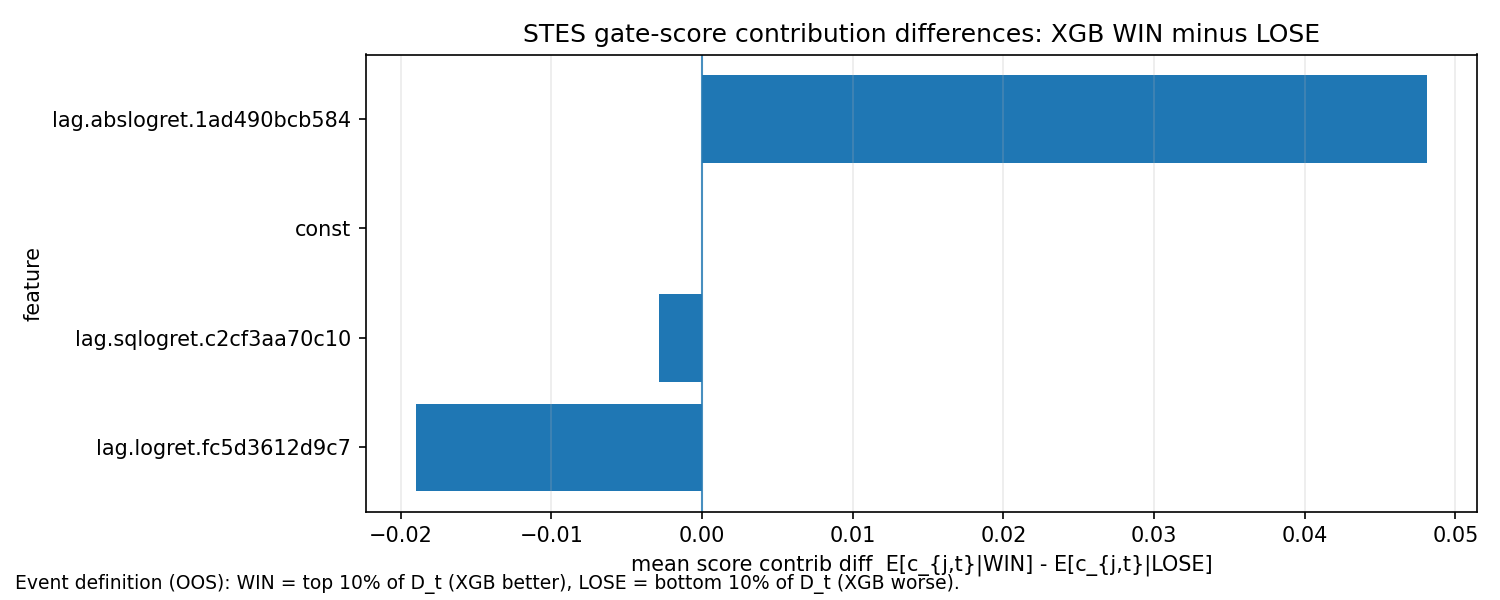 The WIN-minus-LOSE difference is strongly positive on magnitude-related features (e.g., abs returns), with negative shifts on signed and squared-return contributions. Interpreted conservatively, this suggests that XGB outperformance aligns with regimes where magnitude signals are prominent, while its underperformance corresponds to different mixtures of signed vs magnitude signals, where the tree gate may be miscalibrated.