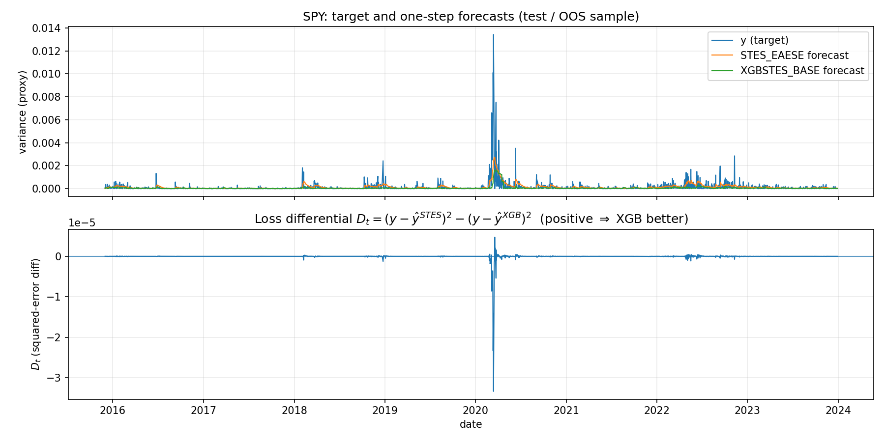 SPY fixed-split OOS: STES_EAESE vs XGBSTES_BASE forecasts and loss differentialThe top panel overlays the OOS target variance proxy and one-step forecasts from STES and XGBSTES. The curves are visually close most days, indicating that both models learn a broadly similar level for day-to-day volatility.
