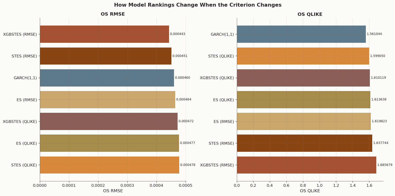 The training loss reshuffles rankings, but only within the metric it targets. Under RMSE, the top three models are all RMSE-trained; under QLIKE, the top three are all QLIKE-aligned (GARCH MLE, STES QLIKE, XGBSTES QLIKE). No single model dominates both lists, confirming that the loss function is a design choice that trades accuracy on one criterion for accuracy on the other.
