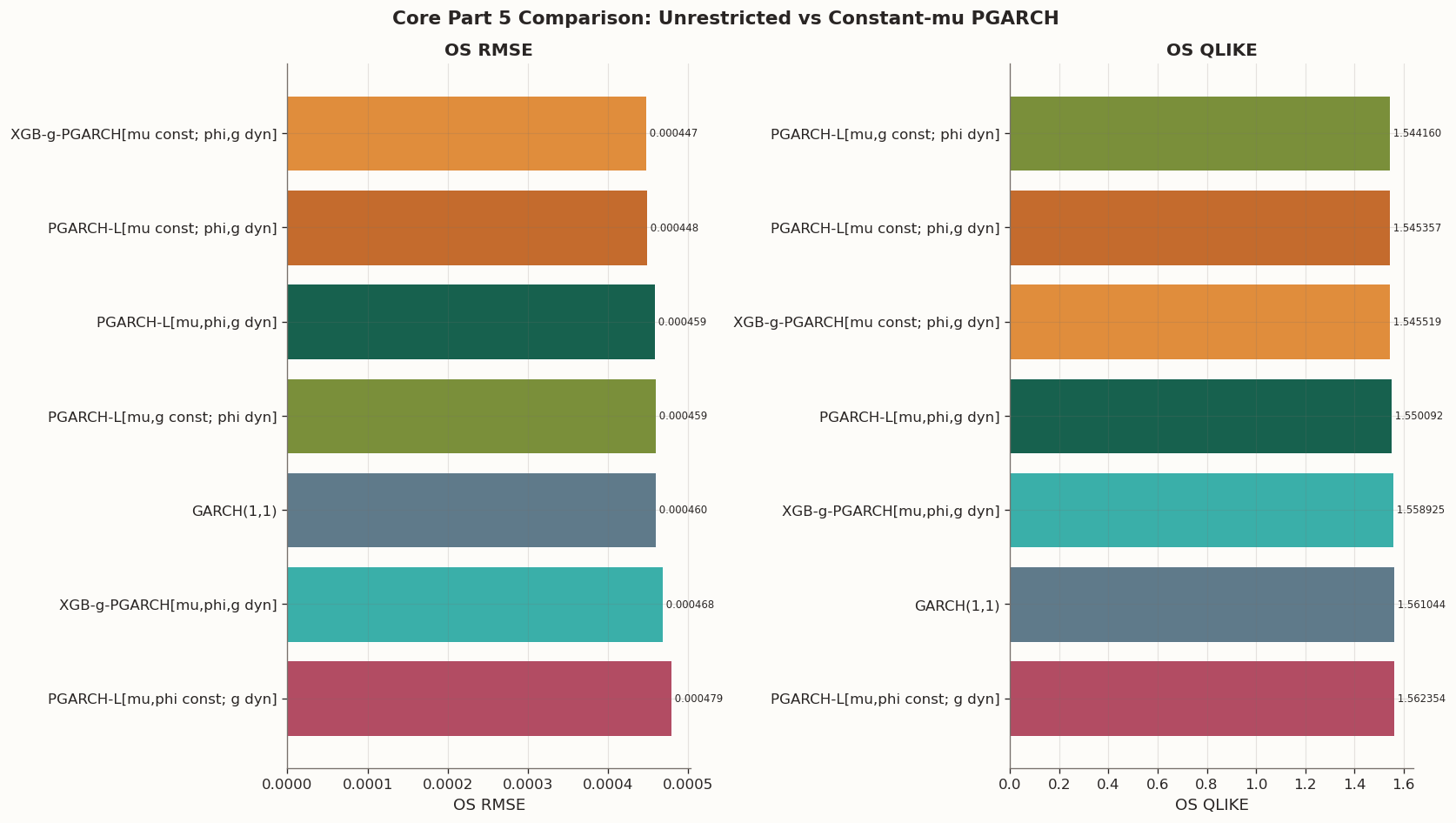The constant-\mu boosted-g model, XGB-g-PGARCH[mu const; phi,g dyn], lands almost exactly on top of the constant-\mu linear model. This is expected and worth understanding precisely, because the same mechanism recurs in Part 6.