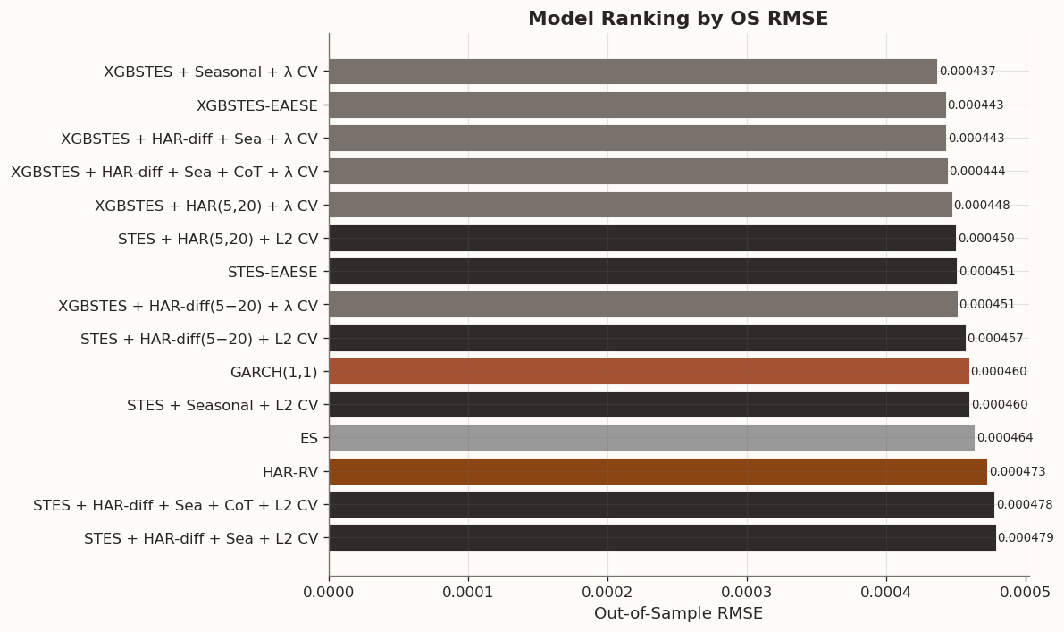 On the addition side, forecast-date timing information is the most useful augmentation. The seasonal-only XGBSTES specification emerges as the narrow RMSE winner, with the baseline XGBSTES model very close behind. However, the gains are small and not statistically significant. Adding CFTC CoT positioning - leveraged-fund net levels and flows for both VIX and S&P 500 futures - on top of the calendar/event features does not improve the picture: the CoT-augmented XGBSTES (OS RMSE 0.000444) is virtually identical to the non-CoT version (0.000443), and the positioning features are absorbed without lifting or noticeably degrading performance.