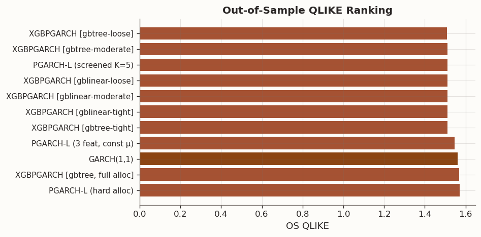 fig, ax = plt.subplots(figsize=(8, 4))sorted_df = results_df.sort_values("OS QLIKE")colors = [BLOG_PALETTE[0] if"GARCH(1,1)"in name else BLOG_PALETTE[1] for name in sorted_df.index]ax.barh(range(len(sorted_df)), sorted_df["OS QLIKE"], color=colors, edgecolor="none")ax.set_yticks(range(len(sorted_df)))ax.set_yticklabels(sorted_df.index, fontsize=9)ax.set_xlabel("OS QLIKE")ax.set_title("Out-of-Sample QLIKE Ranking")ax.invert_yaxis()plt.tight_layout()plt.show()