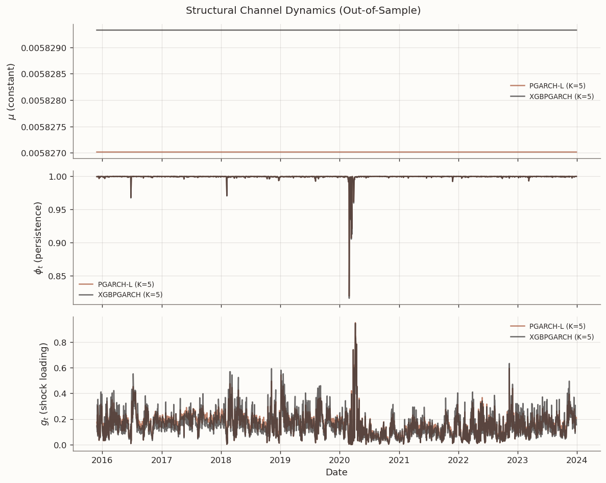 With \mu held constant across both models, the channel diagnostics isolate how the PGARCH-L and XGBPGARCH specifications differ in their dynamic channels. The following plots display the out-of-sample trajectories of \mu, \phi_t, and g_t.