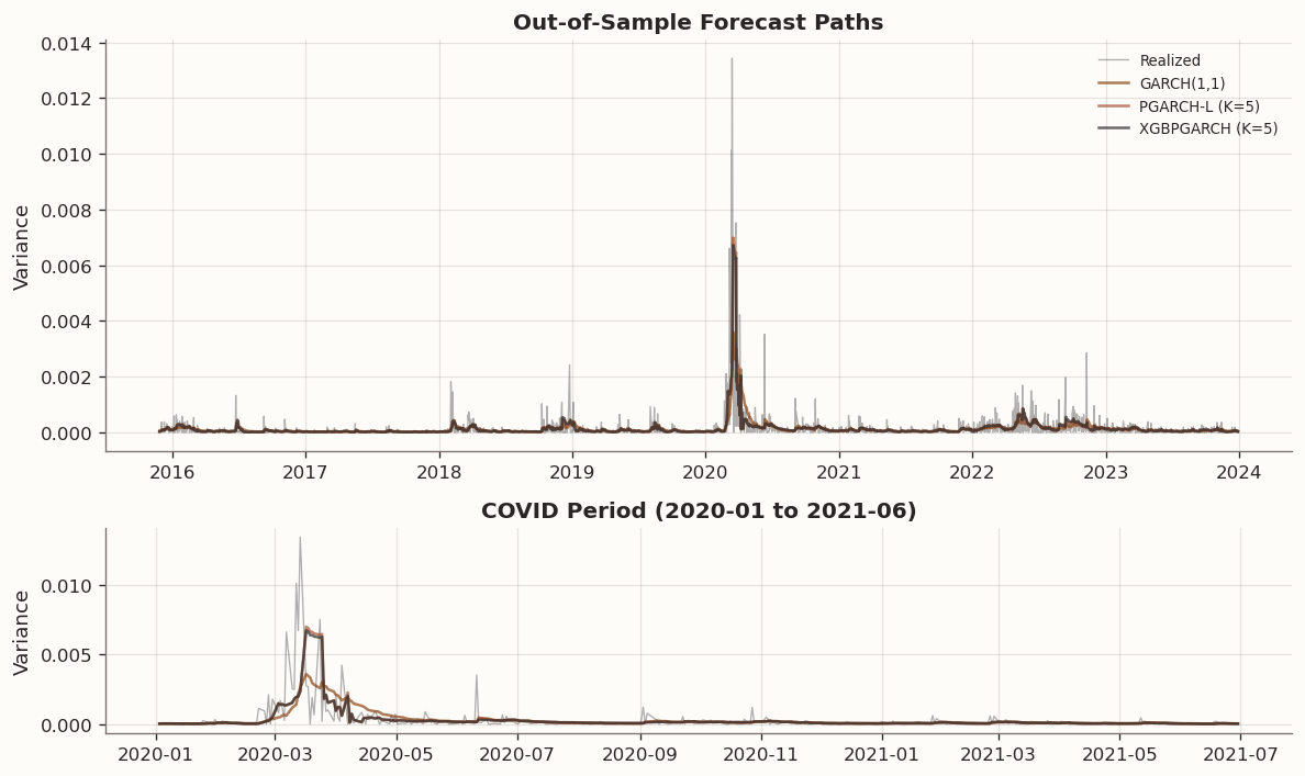 The following visualization compares the out-of-sample variance forecasts of the leading models against the realized squared returns, with a detailed view of the COVID-19 crisis period to assess regime-transition behavior.